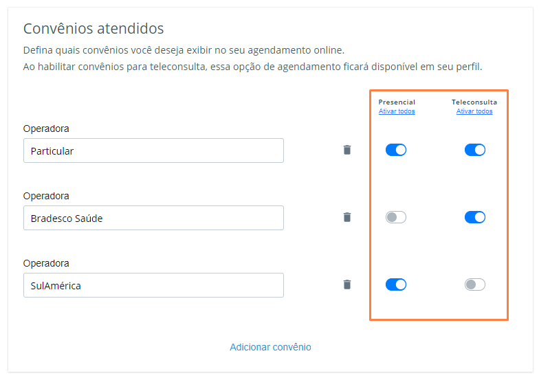Não esqueça de selecionar quais convênios deseja permitir o agendamento online de consultas e para quais deles é possível a teleconsulta. Esse passo acrescenta uma etiqueta em seu perfil online, mostrando que você atende também por teleconsulta (veja este exemplo).