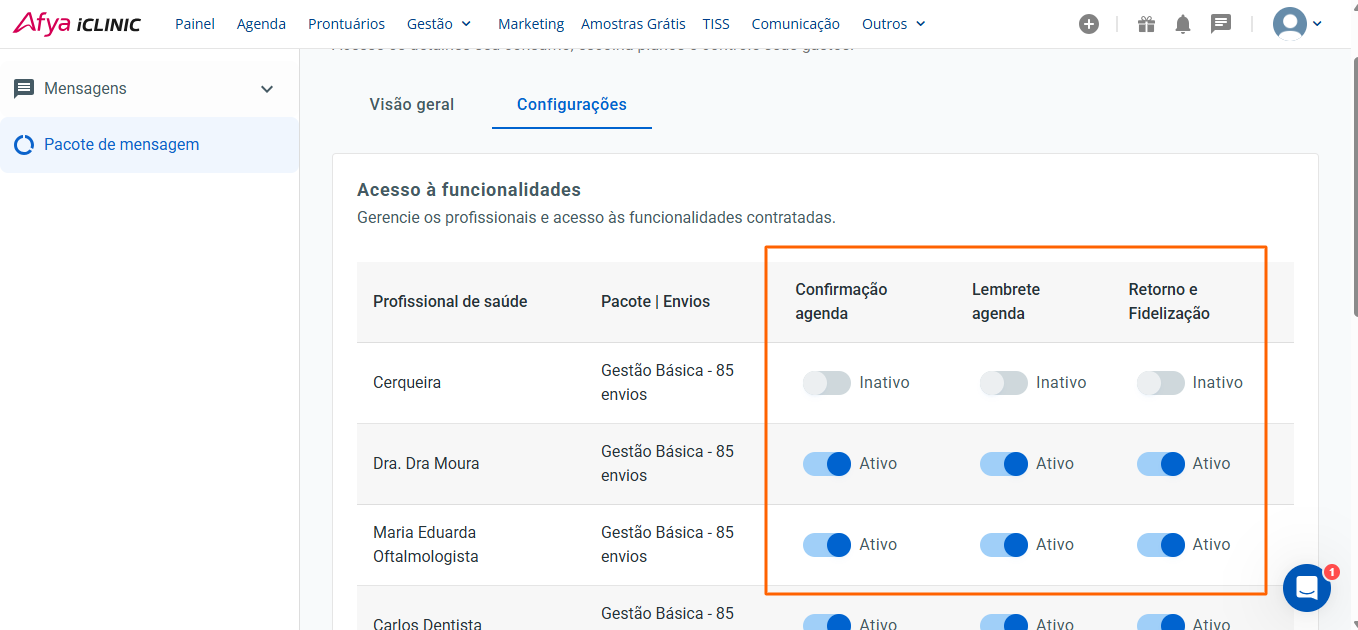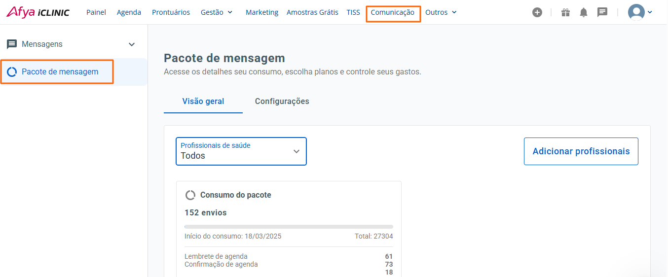 Ao contratar o pacote de envio de mensagens automáticas pelo WhatsApp, você pode acompanhar a quantidade de mensagens enviadas por profissional, verificar quando começará a utilizar o envio excedente unitário e checar o status de envio de cada mensagem.