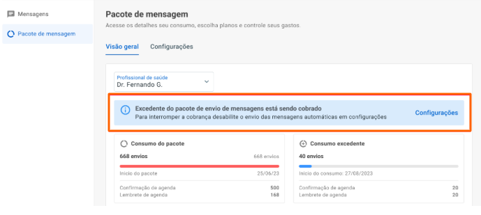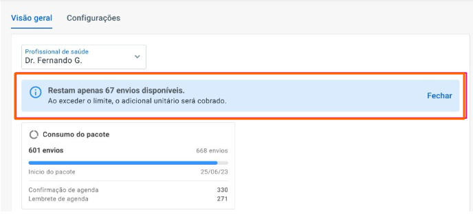 Quando o volume de envios for igual ao volume contratado no pacote, é exibido um alerta. Ele será desativado assim que um novo período de contratação se iniciar, ou se o usuário desabilitar o envio automático de lembretes e confirmações. Também é exibido um descritivo de consumo de excedentes com valor total e por tipo de envio (confirmação e lembrete de consulta):