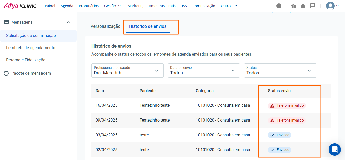 Acessando a aba Comunicação, indo em Mensagens e, em seguia, escolhendo uma das opções Confirmação de Agenda ou Lembrete de Agenda, você terá acessa à opção Histórico de Envios. Neste local possível verificar o histórico de mensagens enviadas e o status de cada uma delas: