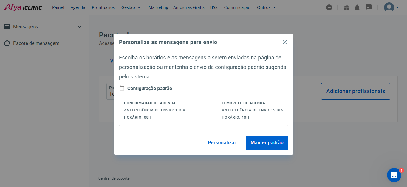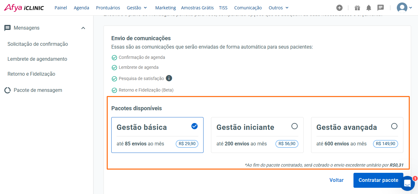 O pacote de mensagens automáticas permite que você envie para seus pacientes, de forma automática, lembretes e confirmações de consultas através do WhatsApp. A contratação pode ser feita somente por usuários que sejam administradores da conta, através da aba Comunicação, independente do plano que possua no Afya iClinic.