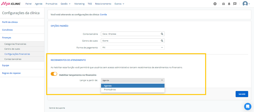 Para permitir que os recepcionistas e demais usuários não administradores gerem recibos, é necessário habilitar em Configurações da Clínica > Configurações financeiras > Recebimentos de atendimentos, passando o ícone de OFF para ON.