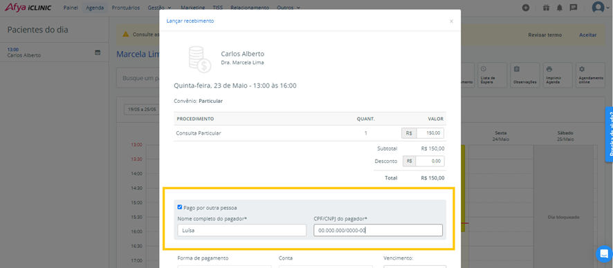 Caso o pagamento seja realizado por outra pessoa, ao lançar o recebimento é possível habilitar a opção “Pago por outra pessoa” e preencher o nome de quem realizou e o CPF ou CNPJ. Essas informações sairão descritas no recibo.