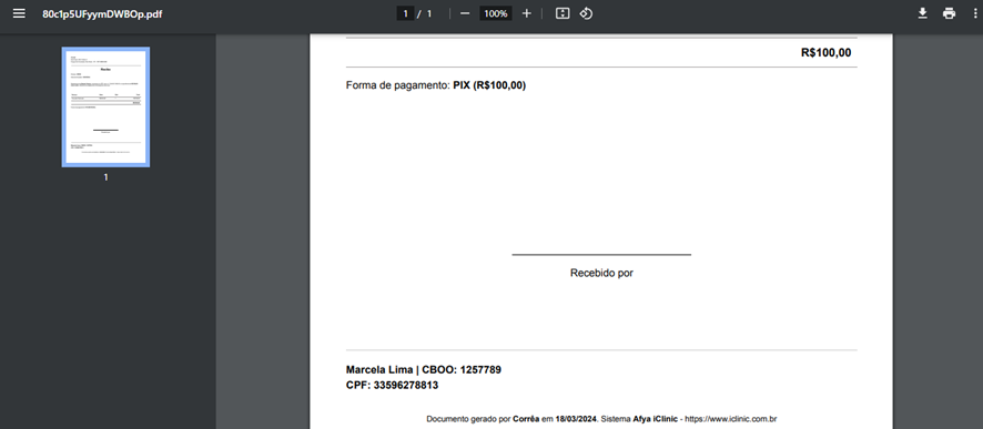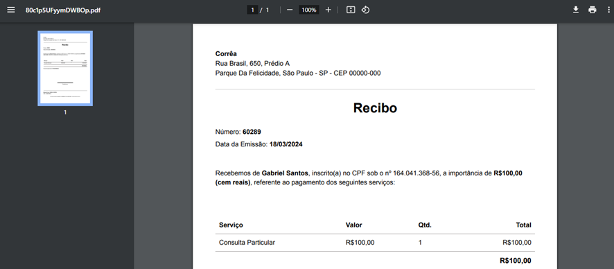 Em seguida, aguarde o sistema processar esta ação. Assim que concluída, será aberta uma nova aba no seu navegado com o recibo gerado em PDF.