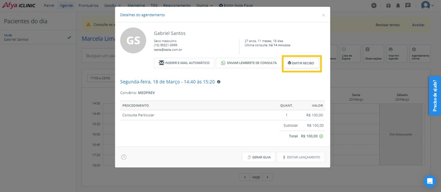 Feito isso, abra o agendamento novamente e clique no botão Emitir Recibo.