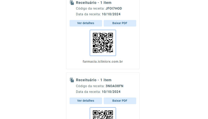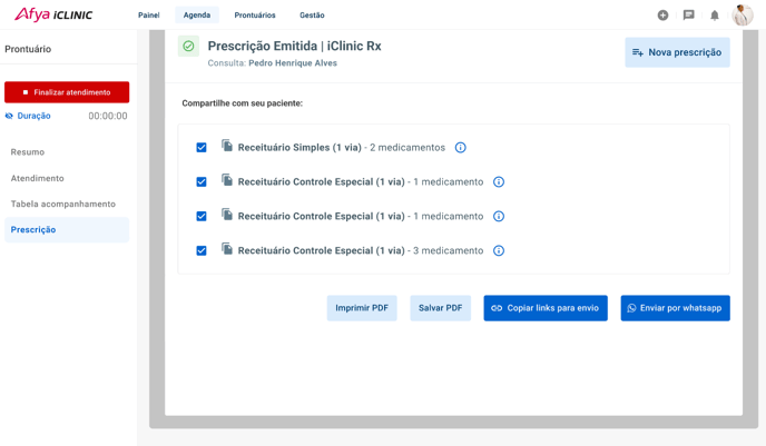 Ao enviar por WhatsApp, o paciente receberá um link contendo as diferentes prescrições, onde ele poderá baixar separadamente.
