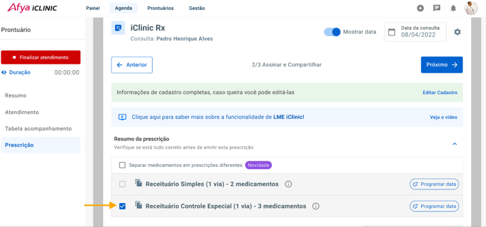 Abaixo, estarão listadas todas as prescrições realizadas, você deve selecionar a caixa de seleção na lateral direita, quais gostaria de separar. Se for o caso, é possível selecionar todas.