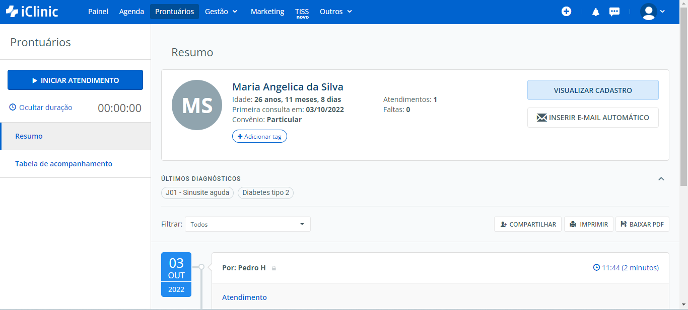 Nós sabemos que os diagnósticos do seu paciente são uma das informações mais importantes na hora de consultar o histórico de um prontuário. Por isso, agora o iClinic traz essa informação em destaque dentro do sistema, veja como ficou: